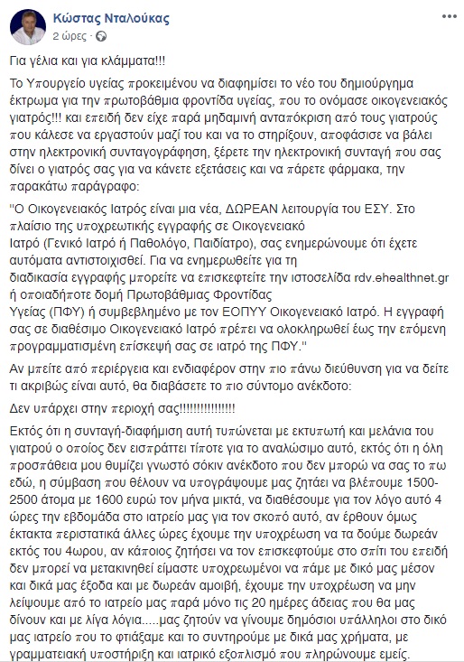 Ο γνωστός παιδίατρος και Πρόεδρος της Ένωσης Ελευθεροεπαγγελματιών Παιδιάτρων Αττικής, Κώστας Νταλούκας, με μια ανάρτησή του στο Facebook κατακεραυνώνει το νέο μέτρο και παρουσιάζει τα αρνητικά που θα προκύψουν από την καθιέρωση του μέτρου σε επίπεδο τόσο ασφαλισμένων όσο και ασθενών.