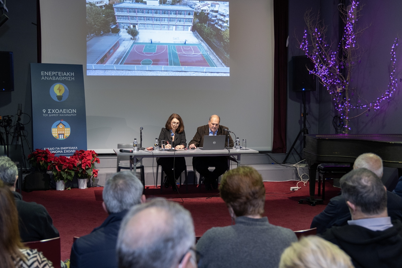 Τα πολύ σημαντικά οφέλη από την ενεργειακή αναβάθμιση 9 σχολείων του Χαλανδρίου, και τα μελλοντικά σχέδια του Δήμου για την ενεργειακή αυτονομία τους και την υλοποίηση του Σχεδίου Δράσης για την Αειφόρο Ενέργεια και το Κλίμα (ΣΔΑΕΚ), παρουσιάστηκαν στην εκδήλωση που πραγματοποιήθηκε στις 19 Δεκεμβρίου 2023, στο Κέντρο Νεότητας, παρουσία του δημάρχου Χαλανδρίου Σίμου Ρούσσου και του τέως περιφερειάρχη Αττικής Γιώργου Πατούλη.