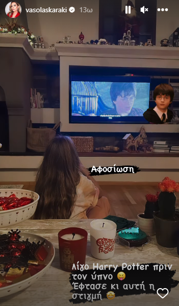 Αυτή τη φορά δημοσίευσε μια φωτογραφία από το στολισμένο σαλόνι του σπιτιού της και μάλιστα φωτογραφίζει την κόρη της Εύα, η οποία παρακολουθεί με αφοσίωση κάποια από τις ταινίες του Harry Potter.