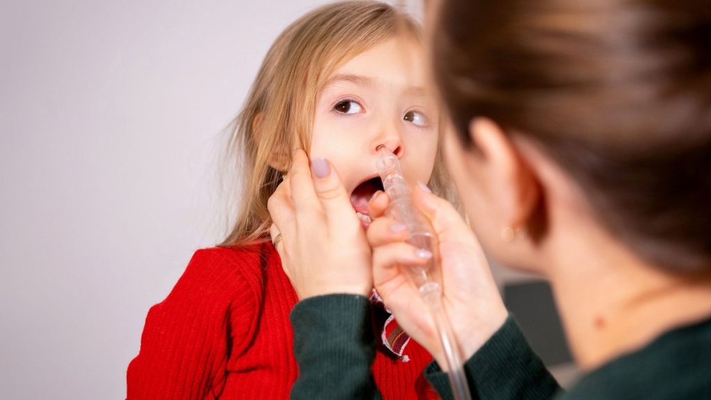 - Σωστή θέση: Το παιδί πρέπει να είναι σε ημιπλαγιαστή θέση, ώστε το υγρό να ρέει φυσικά προς τα έξω και όχι προς το εσωτερικό του ρινοφάρυγγα.
