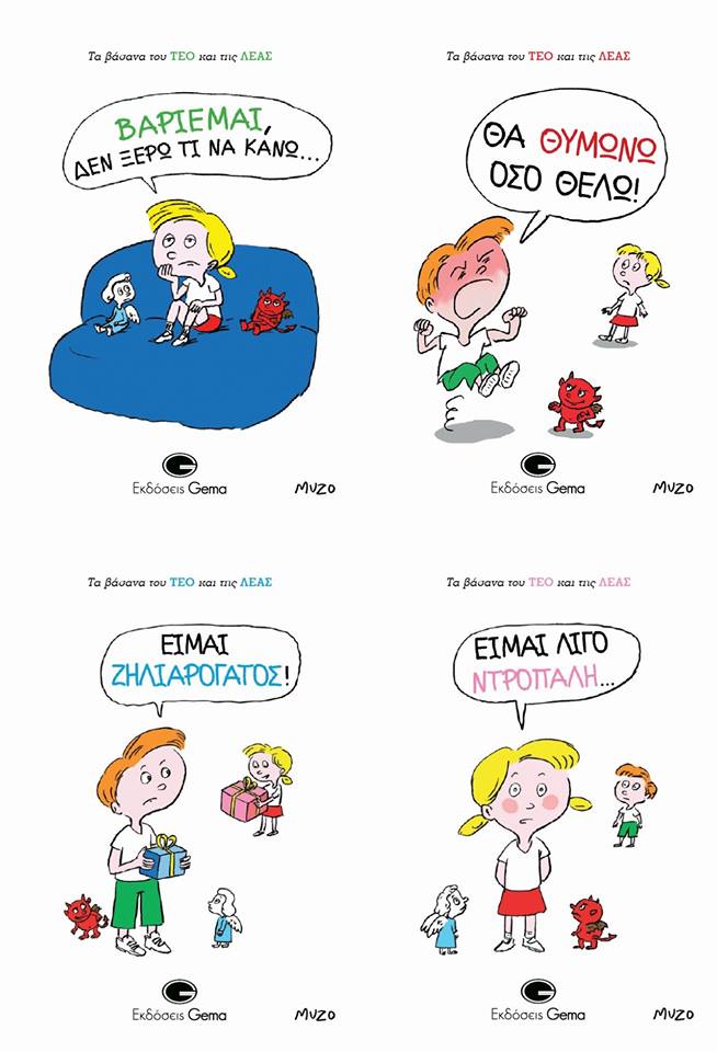 Tα διασκεδαστικά και καθησυχαστικά κόμικς της σειράς “Τα βάσανα του Τέο και της Λέας” είναι βασισμένα στην καθημερινότητα των παιδιών. Τέσσερα βιβλία που βοηθάνε τα παιδιά να αναγνωρίσουν και να καταλάβουν τα συναισθήματά τους. Τι συμβουλή δίνει ο Δόκτωρ Μιζό σε εκείνο το παιδί που είναι λίγο ντροπαλό ή θυμώνει εύκολα, που βαριέται και δεν ξέρει τι να κάνει ή αισθάνεται έντονα το συναίσθημα της ζήλιας;
