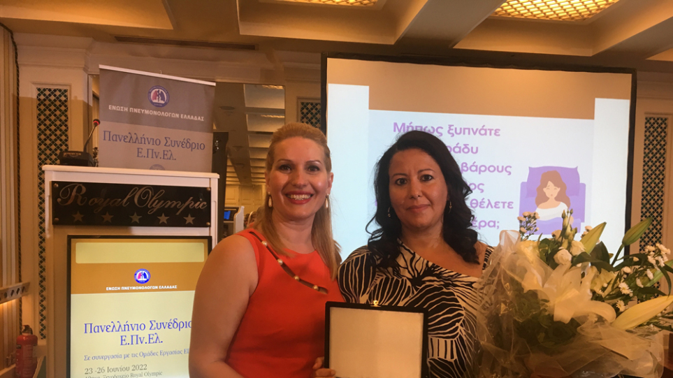 Εμφανώς συγκινημένη, η σύζυγος του άτυχου πνευμονολόγου, Αντώνη Χατζηγεωργίου, η οποία είδε το σύζυγό της να «φεύγει» από τη ζωή, όταν μολύνθηκε από ασθενή του με κορωνοϊό τον Νοέμβριο του 2020, τιμήθηκε με βραβείο από την Ένωση Πνευμονολόγων Ελλάδας για τη συνολική προσφορά του άντρα της στην πνευμονολογία, καθώς και στη μάχη κατά της πανδημίας.