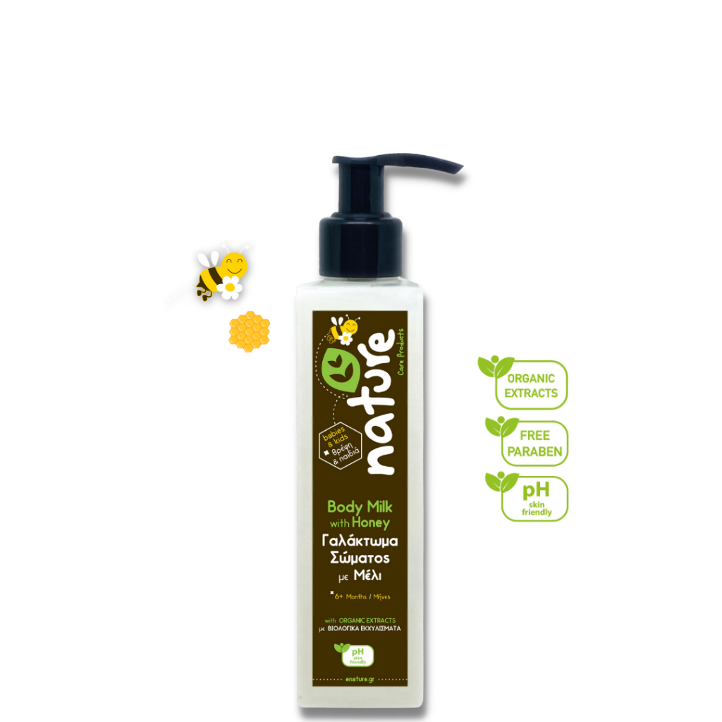 Το νέο φυσικό γαλάκτωμα σώματος με βιολογικό εκχύλισμα μελιού NATURE, για βρέφη (6+ Μηνών) & παιδιά, στη νέα εύχρηστη & ανακυκλώσιμη συσκευασία (200ml), είναι ειδικά σχεδιασμένο για το ευαίσθητο δέρμα του μωρού ή του παιδιού. Το βιολογικό εκχύλισμα μελιού προσφέρει καθημερινή ενυδάτωση και θρέψη ενώ τα πλούσια βιολογικά εκχυλίσματά που περιέχει, προστατεύουν το δέρμα αφήνοντάς το εξαιρετικά απαλό.