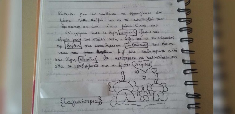 «…δύσκολο για τον καθένα να προσαρμοστεί εδώ μέσα, πόσο ακόμα και να το αντιληφθεί πως βρίσκεται σε ένα τέτοιο μέρος. Όμως σας υπόσχομαι πως με λίγη υπομονή (ξέρω και εμένα μου τη σπάει αυτή η λέξη, μα τι να κάνουμε), τη βοήθεια των καταπληκτικών ανθρώπων που βρίσκονται μαζί μας καθημερινά αλλά και λίγη ελπίδα θα καταφέρετε να καταπολεμήσετε όλα τα προβλήματα και να βγείτε νικητές»…