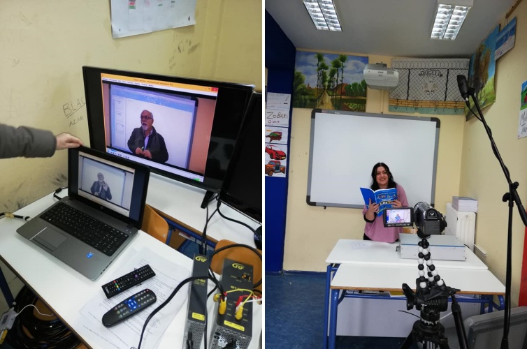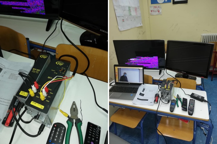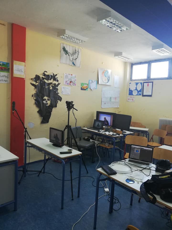 Στις φωτογραφίες παρακάτω φαίνεται η διαδικασία της δημιουργίας και λειτουργίας του καναλιού, το οποίο “παίζει” από το μεσημέρι της Παρασκευής συνεχώς. Μία από τις αίθουσες διδασκαλίας, η αίθουσα “Διονύσιος Σολωμός”, έχει μετατραπεί σε τηλεοπτικό στούντιο, στο οποίο παίρνουν θέση οι εκπαιδευτικοί και… παραδίδουν “ακούραστα και με χαρά”, όπως ο ίδιος περιγράφει!
